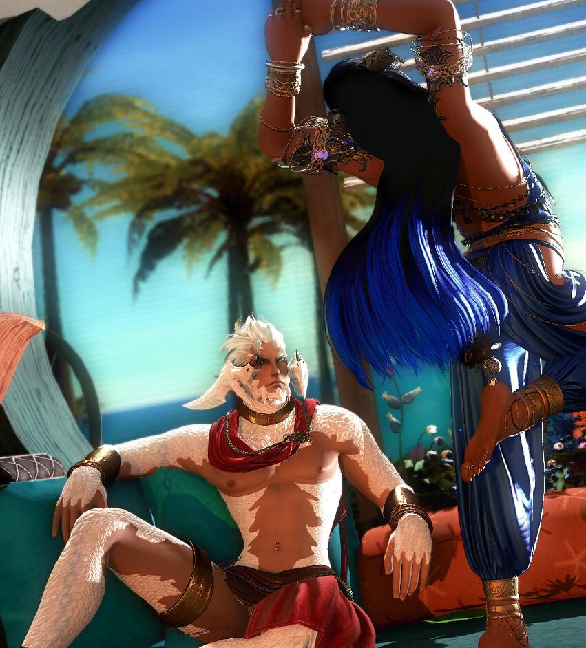 The Full StorySable is part of the Keepers of the moon. His family is part of the royal line. However, being a male "Keeper", he's held to a low regard and seen by most as only a breeding royal, subservient to the common female miqo'te of the clan. As per his duty as a male keeper, he is promised to another tribe among his people who need strong genes within the family. However, being the only child and born in the daytime unlike the others, his mother has always kept him under a tight leash. A gift miqo'te that almost anyone would want their hands on.With eyes slit, he is different to the others of his clan, causing his mother to be all the more protective of him in a negative way. His ability to see the living energy, the Aether of others, making him for a popular choice among the most prominent figures of the matriarchies of the Keepers. Keeping him at home at all times. Rarely letting him go out and about. Leaving him under the watchful eyes of the Royal guard until he has reached his age of maturity before he is taken at home by the matriarch of another clan. Before leaving with her after. His mother only allowing specific females to visit him. Matriarchs of other clans, to assess him and pick him for when he reaches the age of maturity.On his 16th birthday, he is finally chosen by one of the worst matriarchs he's known. A female who is dominant and cruel. A female that almost forced him into sex, making him helpless to her advances. Upon realizing such, he escapes her clutches and runs away. Although partial to women, Sable not only has slit eyes. He is also more attracted to his gender, being bisexual in his clan being nothing but an large issue. So, he runs away. Finds safety in Ul 'dah, and becomes a popular exotic male dancer in multiple establishments while keeping away from his family, and the one who only wanted to use him as nothing but a breeding toy. Later becoming one of the best Dancers in all of Eorzea. Part of a dancing group called Astarae.